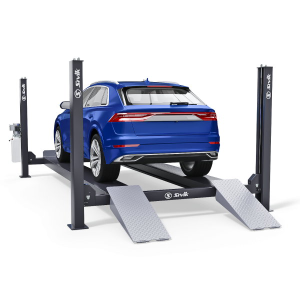 Подъемник электрогидравлический четырехстоечный ПГА-6500/4 (SIVIK) г/п 6.5 тонн (длинна платформ 5300 мм, с трапами 6479 мм, расстояние между колоннами 2945 мм), предназначен для системы сход-развал колес и слесарных работ оснащен местами для поворотных кругов и задними сдвижными платформами, оборудован траверсой г/п 3.6 тонны встроенная в систему, синхронизация тросовая по периметру, каждая стойка имеет блокировку по безопасности. Высота подъема 1850 мм ...