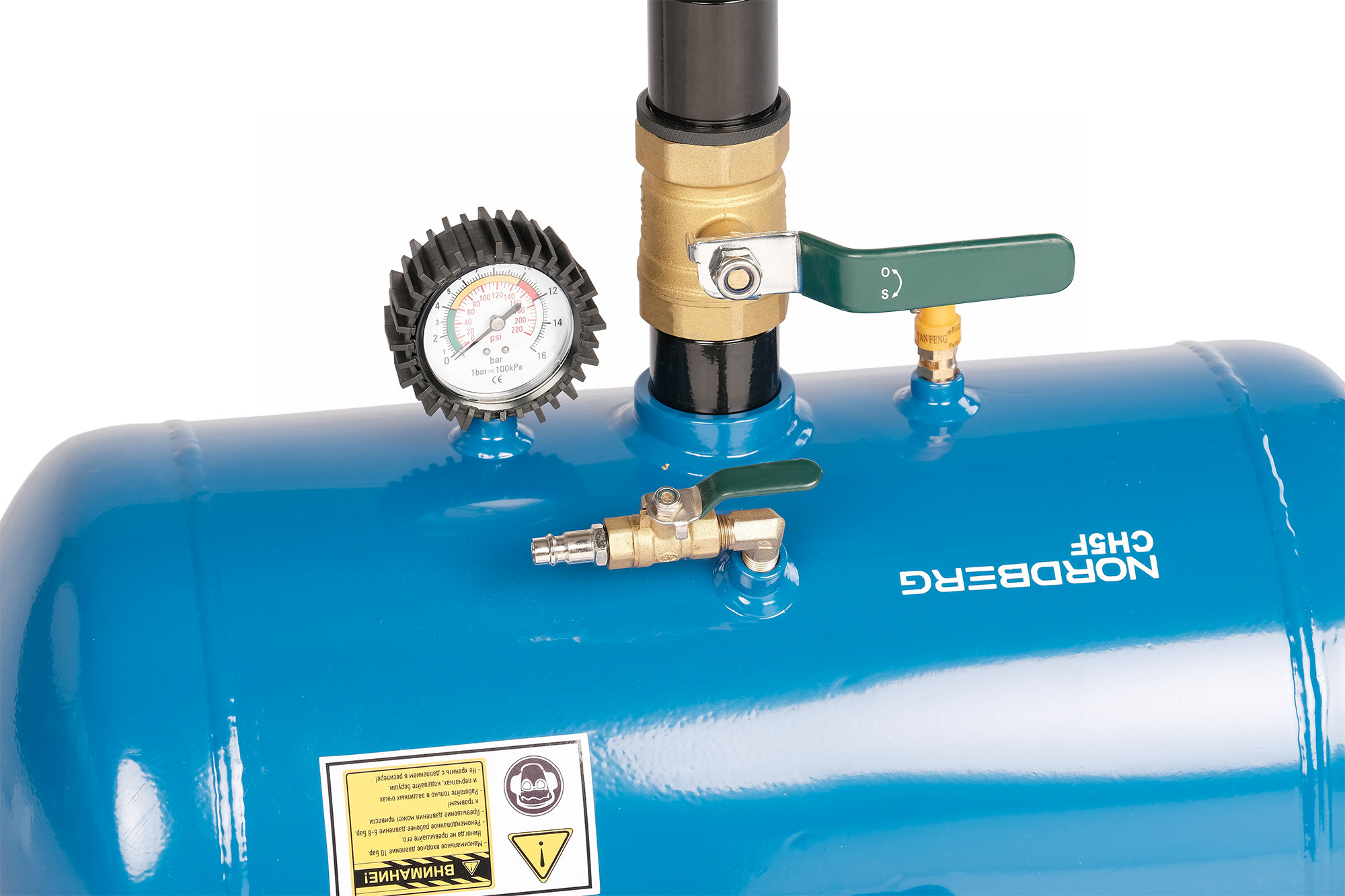 Оснащен предохранительным клапаном, манометром, быстросъемным переходником европейского типа "папа"
